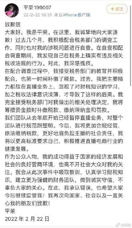 在被通报后的当天下午,平荣就通过微博公开道歉,称完全接受税务部门作出的相关处理决定,将筹措资金按时补缴税款、缴纳滞纳金和罚款。随后,其微博账号“平荣199007”也被关闭。